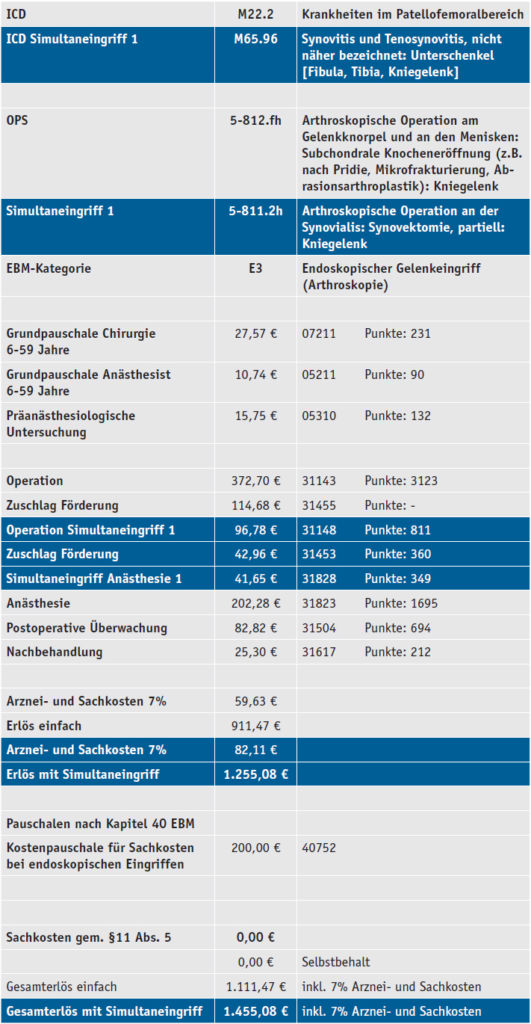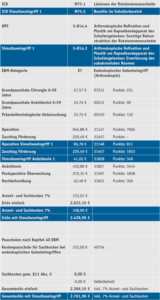 Vergleichbares gilt für das zweite Praxisbeispiel. Dieses Beispiel wird durch die arthroskopische Erweiterung des subacromialen Raumes als Simultaneingriff ergänzt. Die AOP-Abrechnung unter Berücksichtigung des Simultaneingriffes ist um 16,7 Prozent höher gegenüber der alleinigen Abrechnung des Haupteingriffes.
