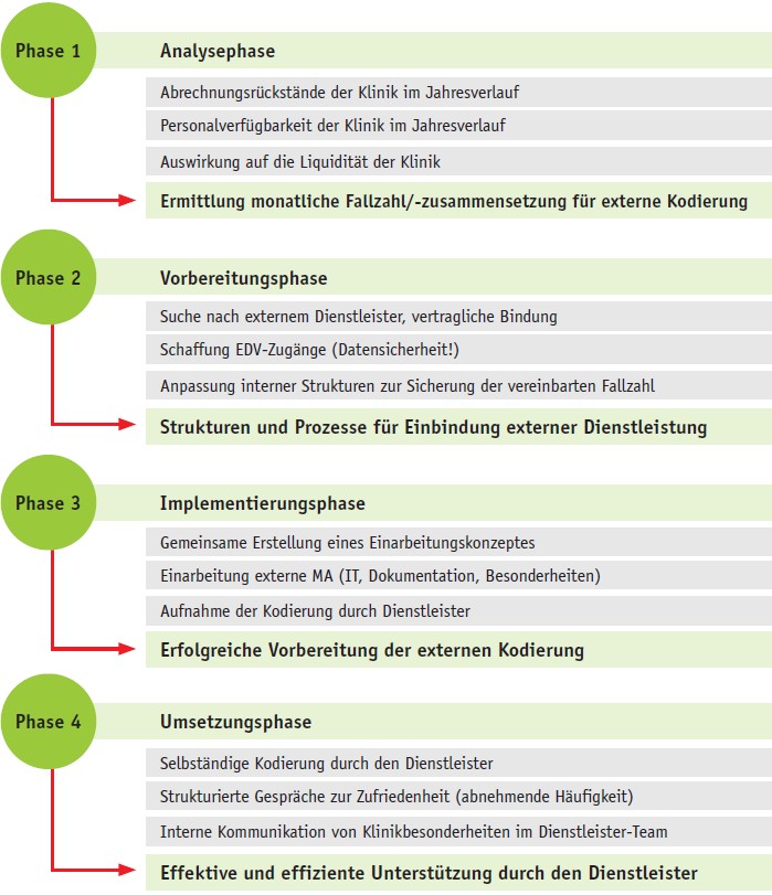 Eine naheliegende Konsequenz ist die Einbindung kontinuierlicher Kodierunterstützung, um die speziellen Probleme immer wechselnder externer Dienstleister zu vermeiden. Durch eine Planbarkeit des Personaleinsatzes gewinnt der Dienstleister die Möglichkeit, in der jeweiligen Klinik eingearbeitetes Personal zum Einsatz zu bringen, wodurch die Häufigkeit einer klärenden Kommunikation zwischen Klinik und Fremdpersonal sukzessive reduziert wird. Die Verlagerung von Kodieraufgaben, medizinischen Begründungen und anderen Tätigkeiten im Umfeld des Fallabschlusses an externe Experten entlastet das Klinikpersonal, welches sich verstärkt strategischen Aufgaben widmen kann.