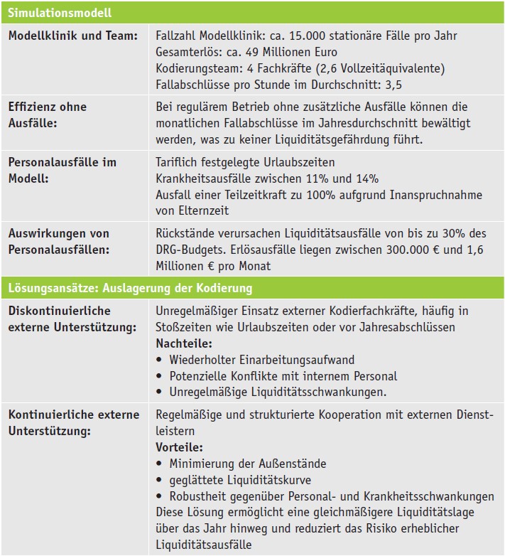 Die Kodierung von Diagnosen und Prozeduren bildet die Grundlage für die stationäre Abrechnung und somit für die finanzielle Stabilität der Krankenhäuser. Die kurzfristige Abrechnung von Behandlungsfällen ist essenziell für die Liquidität der Klinik, wobei Urlaubszeiten und insbesondere Krankheitsausfälle der zuständigen Mitarbeitenden zusätzlich zu regelmäßigen kritischen Engpässen führen.